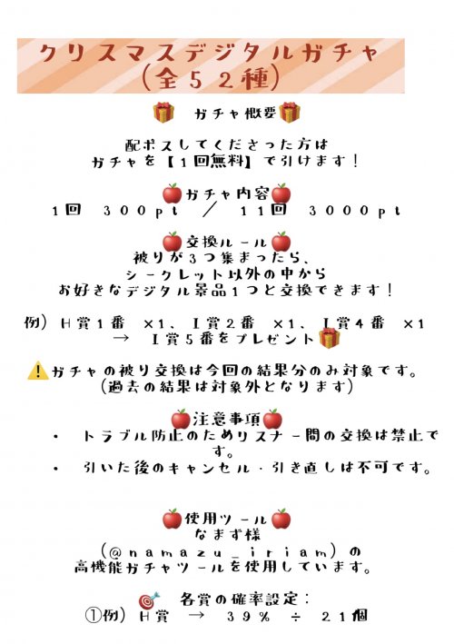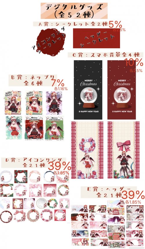 🎲 本日17:00〜20:00 🎲 歌枠&デジガチャ枠やります!✨ 🎄 クリスマスガチャ(全52種) 🎄 パネル開けで使用してくれたポイントでもガチャが引けます! 希望の方は「引きたいよ!」と教えてください🙌 👇 デジガチャの詳細・ラインナップはこちら! ※D賞・E賞は3・4枚目をご確認ください🙏